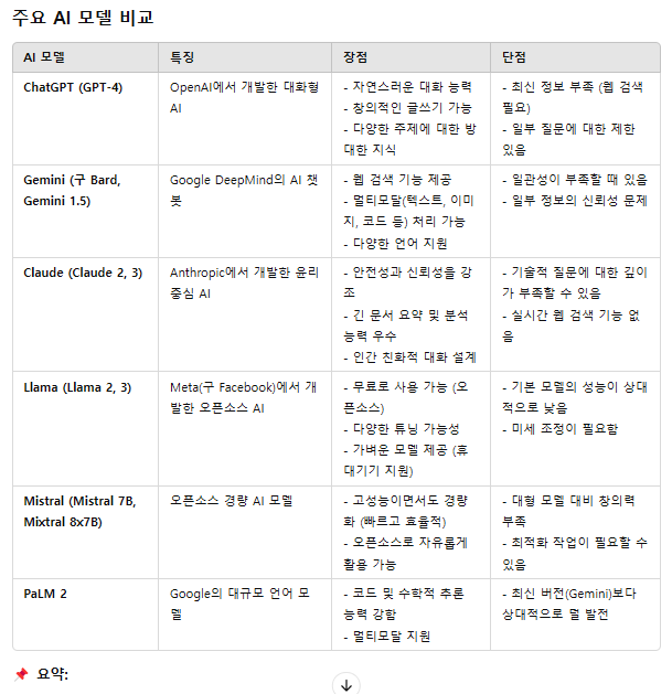 주요 AI 모델들을 나열하고 각각의 특징을 중심으로 장점과 단점을 비교하여 간략하게 정리해 줘.